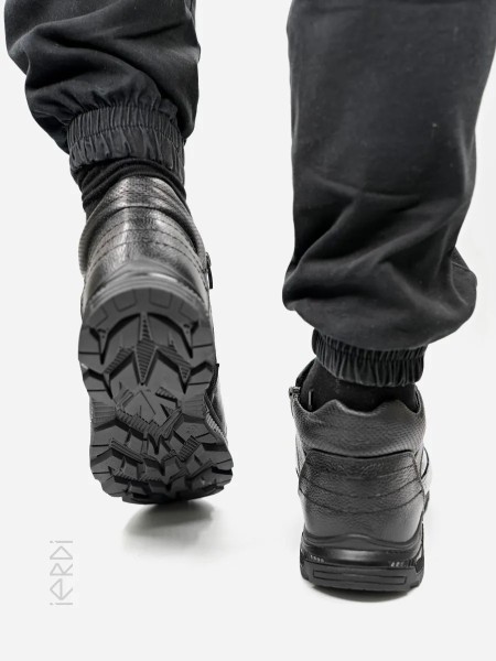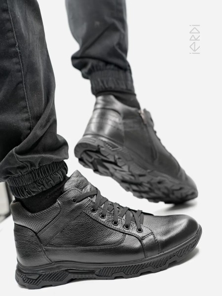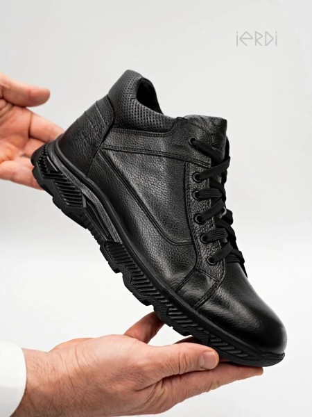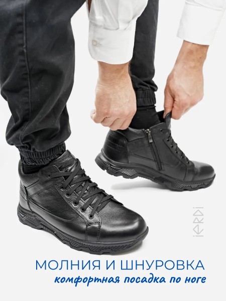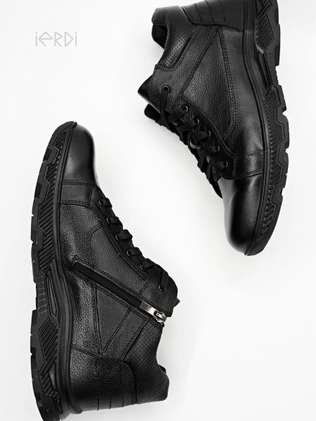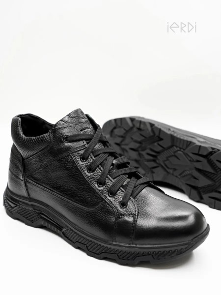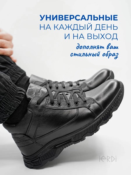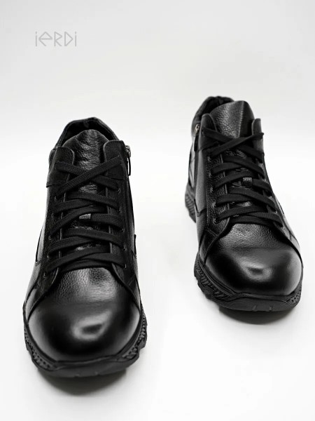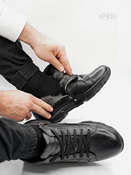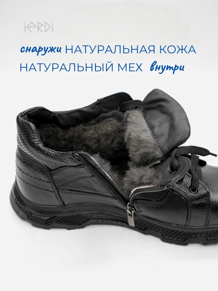 Мужские зимние ботинки черного цвета от бренда IERDI - обувь на холодную зиму для мужчин, которые ценят комфорт. Температурный режим носки данной модели - до -20 градусов. Полуботинки выполнены из натуральной кожи и утеплены шерстяным мехом (овчина и текстиль в пропорции 40 на 60 %). Теплая подкладка и стелька не позволят вашим ногам замерзнуть, сохранят тепло и сухость ног, создав комфортный микроклимат. Подошва с небольшой устойчивой платформой не скользит, отлично амортизирует и комфортна даже при длительной носке. Для удобства надевания ботинки оснащены 2 молниями по бокам.