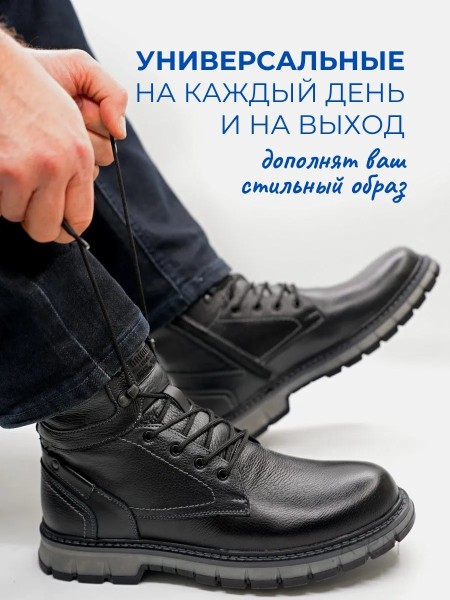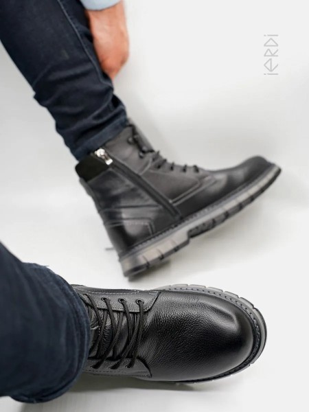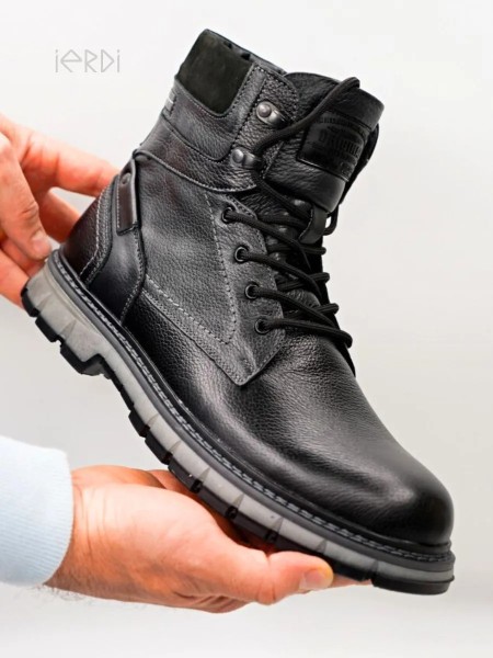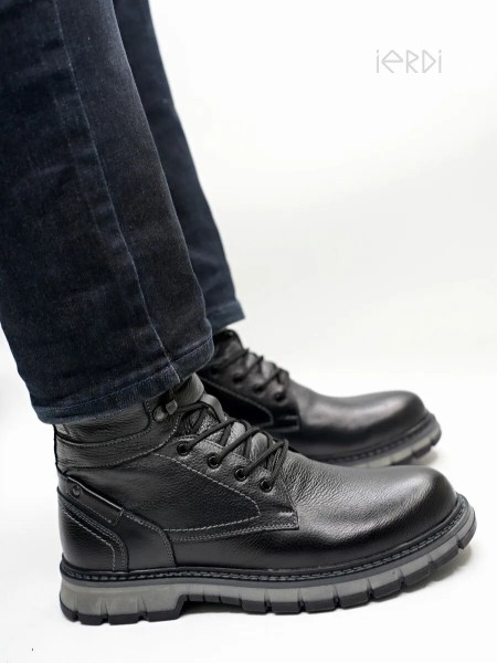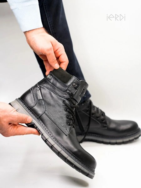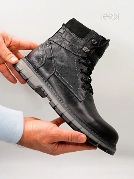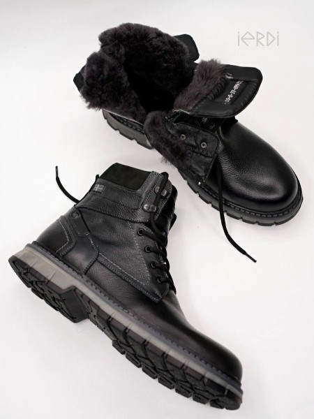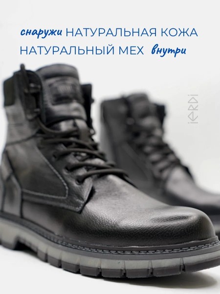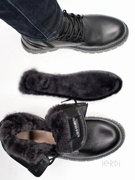 Высокие ботинки IERDI - ваш идеальный вариант на холодную зиму. Выполнены из натуральной кожи, внутри утеплены мехом на основе натуральной овечьей шерсти, стелька также теплая, съемная. Модель оснащена молнией для быстрого снятия и шнуровкой для комфортной посадке на ноге. Нескользящая подошва из термоэластопласта с протектором выдерживает до - 25..-30 С. Подошва прошита. Рабочие ботинки на тракторной подошве обеспечат хорошую устойчивость на скользкой дороге, а также отлично подойдут для ежедневной носки.