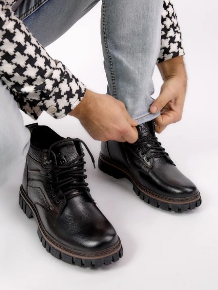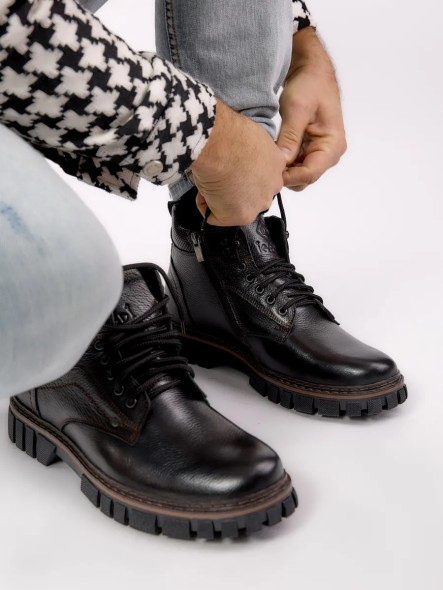 Зимние ботинки IERDI – трендовая непромокаемая обувь, сочетающаяся с разными стилями одежды. Материал верха – натуральная кожа, подкладка и стелька выполнены из меха, используемого для сохранения тепла. Также у ботинок предусмотрена ортопедическая одежда. Подошва выполнена из ТЭП. Для фиксации обуви используется шнуровка. Данная модель представлена в черном цвете, размерном ряде – от 39 до 45. Ботинки станут отличным дополнением вашего образа.