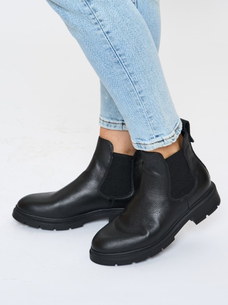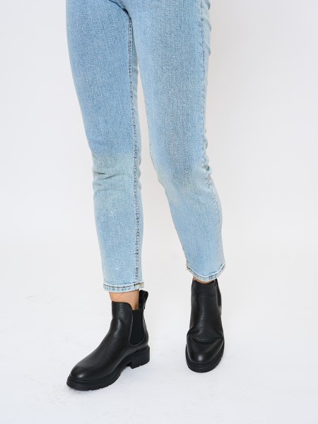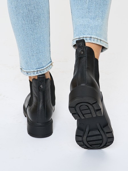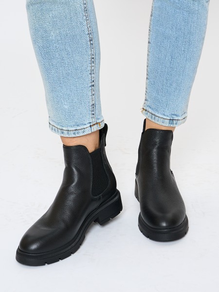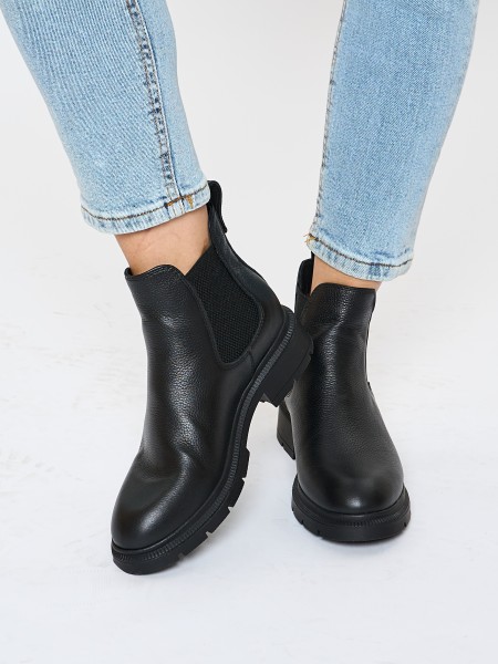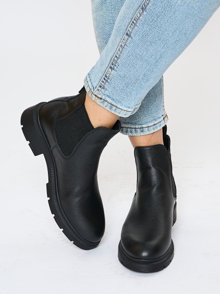 Классические зимние кожаные ботинки на высокой подошве уместны в офисе, в университете, в школе. Черный цвет ботинок делает эту модель универсальной и подходящей к любому образу. Кожаные челси с утеплением из меха - отличный вариант женской обуви на зимний сезон.