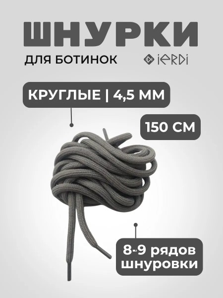 Серые шнурки от бренда IERDI - универсальные шнурки для мужской, женской и детской обуви любого цвета. Длина шнурков 150 см, а диаметр 4,5 мм. Они идеально подойдут для 8-9 рядов шнуровки, например, для низких берцев, высоких кроссовок или тимберлендов. Данная модель отличается качеством - хорошо держит шнуровку, не развязываясь при беге и ходьбе и надежно фиксируя обувь на ноге. Серые шнурки подойдут как для спортивных конверсов и бутс так и для повседневных вансов. Данная модель так же может использоваться как шнурок для одежды.
