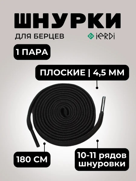 Черные плоские шнурки от бренда IERDI - универсальные шнурки для мужской, женской и детской обуви любого цвета. Длина шнурков 180 см, а ширина 4,5 мм. Они идеально подойдут для 10-11 рядов шнуровки, например, для высоких ботинок, армейских берц или же сапогов. Данная модель отличается качеством - хорошо держит шнуровку, не развязываясь при беге и ходьбе и надежно фиксируя конверсы на ноге. Темные шнурки подойдут как для спортивной так и для повседневной обуви. Данная модель так же может использоваться как шнурок для одежды.