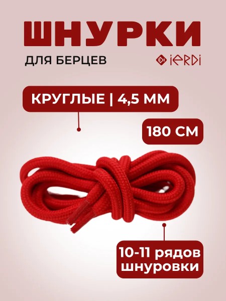 Красные шнурки от бренда IERDI - яркие шнурки для мужской, женской и детской обуви. Длина шнурков 180 см, а диаметр 4,5 мм. Они идеально подойдут для 10-11 рядов шнуровки, например, для высоких ботинок, армейских берц, сапогов или гриндерсов. Данная модель отличается качеством - хорошо держит шнуровку, не развязываясь при беге и ходьбе и надежно фиксируя обувь на ноге. Алые шнурки подойдут как для спортивной так и для повседневной обуви. Данная модель так же может использоваться как шнурок для одежды.