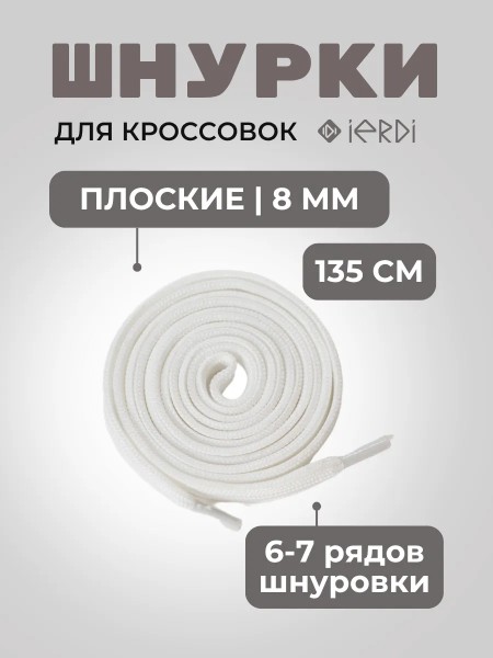 Белые шнурки от бренда IERDI - универсальные шнурки для мужской, женской и детской обуви любого цвета. Длина шнурков 135 см, а ширина 8 мм. Они идеально подойдут для 6-7 рядов шнуровки, например, для кроссовок, кед и полуботинок. Данная модель отличается качеством - хорошо держит шнуровку, не развязываясь при беге и ходьбе и надежно фиксируя обувь на ноге. Светлые шнурки подойдут как для спортивной так и для повседневной обуви. Данная модель так же может использоваться как шнурок для одежды.