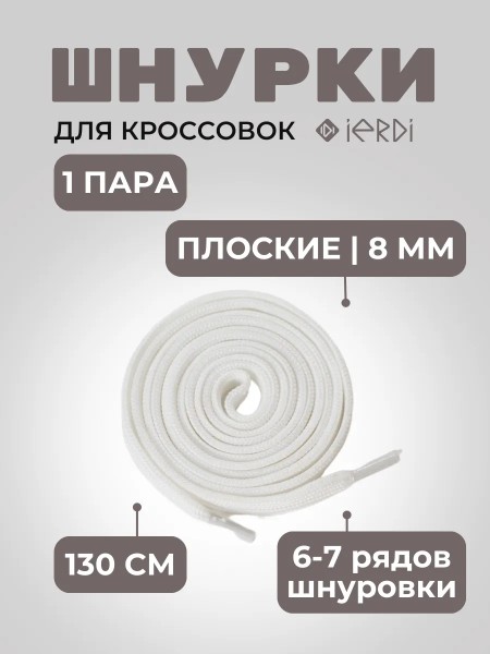 Белые шнурки от бренда IERDI - универсальные шнурки для мужской, женской и детской обуви любого цвета. Длина шнурков 130 см, а ширина 8 мм. Они идеально подойдут для 6-7 рядов шнуровки, например, для кроссовок, кед и полуботинок. Данная модель отличается качеством - хорошо держит шнуровку, не развязываясь при беге и ходьбе и надежно фиксируя обувь на ноге. Светлые шнурки подойдут как для спортивной так и для повседневной обуви. Данная модель так же может использоваться как шнурок для одежды.