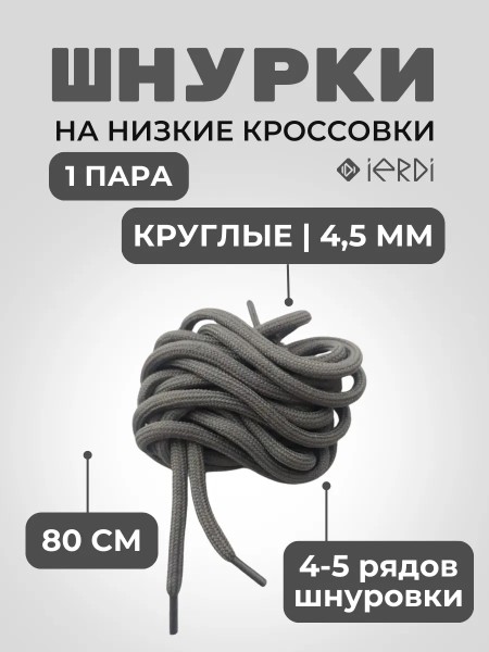 Серые шнурки от бренда IERDI - универсальные шнурки для мужской, женской и детской обуви. Длина шнурков 80 см, а ширина 4,5 мм. Они идеально подойдут для 4-5 рядов шнуровки, например, для кед, деззертов и полуботинок. Данная модель отличается качеством - хорошо держит шнуровку, не развязываясь при беге и ходьбе и надежно фиксируя обувь на ноге. Темно - серые шнурки подойдут как для спортивной так и для повседневной обуви. Данная модель так же может использоваться как шнурок для одежды.