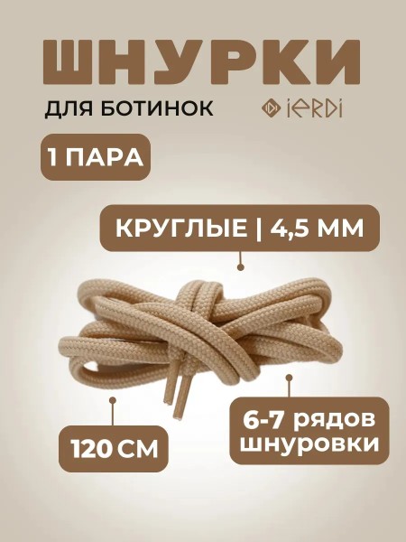 Бежевые шнурки от бренда IERDI - универсальные шнурки для мужской, женской и детской обуви любого цвета. Длина шнурков 120 см, а диаметр 4,5 мм. Они идеально подойдут для 6-7 рядов шнуровки, например, для кроссовок, ботинок и полуботинок. Данная модель отличается качеством - хорошо держит шнуровку, не развязываясь при беге и ходьбе и надежно фиксируя обувь на ноге. Свеьтлые шнурки подойдут как для спортивной так и для повседневной обуви. Данная модель так же может использоваться как шнурок для одежды.