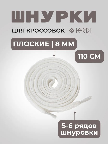 Белые шнурки от бренда IERDI - универсальные шнурки для мужской, женской и детской обуви любого цвета. Длина шнурков 110 см, а ширина 8 мм. Они идеально подойдут для 5-6 рядов шнуровки, например, для кроссовок, кед и полуботинок. Данная модель отличается качеством - хорошо держит шнуровку, не развязываясь при беге и ходьбе и надежно фиксируя обувь на ноге. Светлые шнурки подойдут как для спортивной так и для повседневной обуви. Данная модель так же может использоваться как шнурок для одежды.