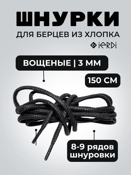 Черные вощеные хлопковые шнурки от бренда IERDI - универсальные шнурки для мужской, женской и детской обуви любого цвета. Длина шнурков 150 см, а диаметр 3 мм. Они идеально подойдут для 8-9 рядов шнуровки, для низких берцев, высоких кроссовок или тимберлендов. Данная модель отличается качеством - хорошо держит шнуровку, не развязываясь при беге и ходьбе и надежно фиксируя обувь на ноге. Черные шнурки подойдут как для спортивной так и для повседневной обуви. Данная модель так же может использоваться как шнурок для одежды.