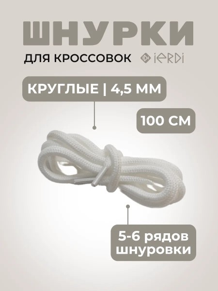 Белые шнурки от бренда IERDI - универсальные шнурки для мужской, женской и детской обуви любого цвета. Длина шнурков 100 см, а диаметр 4,5 мм. Они идеально подойдут для 5-6 рядов шнуровки, например, для кроссовок, ботинок и полуботинок. Данная модель отличается качеством - хорошо держит шнуровку, не развязываясь при беге и ходьбе и надежно фиксируя обувь на ноге. Светлые шнурки подойдут как для спортивной так и для повседневной обуви. Данная модель так же может использоваться как шнурок для одежды.