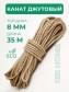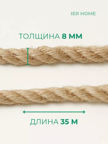 Канат джутовый IER HOME линейки товаров для дома от бренда IERDI толщиной 8 мм, длиной 35 метров. Состав: 100% натуральный джут. Джутовая 3х ниточная (трехниточная) веревка имеет равномерную по всей длине ширину и текстуру, без резкого запаха и включений. Джутовый канат средней толщины 8 мм отличается высокой прочностью и долговечностью. Длина каната - 35 метров.