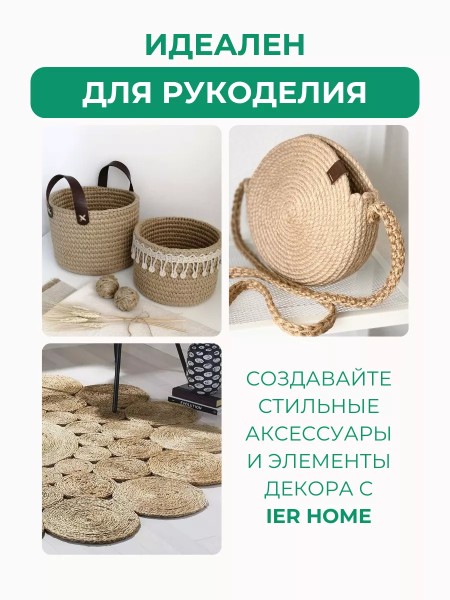 Джутовая нить отлично подходит для рукоделия и поделок в сад или школу. С ним вы можете плести и вязать сумки, корзины, макраме, ковры, салфетки и плейсменты для посуды. Бечевка хороша и для декора предметов интерьера: бутылок, ваз, кашпо для цветов.