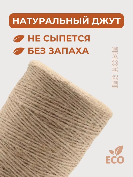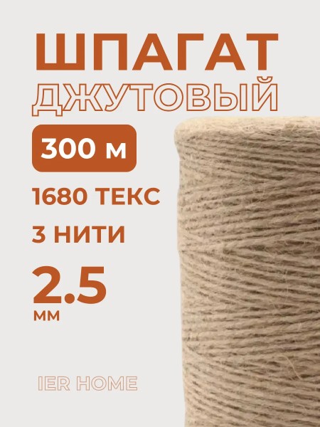 Натуральный джутовый шпагат IERHOME изготовлен из отборного волокна джута, скрученного в тонкие трехниточные пряди золотисто-коричневого цвета. Толщина нити составляет 2,5 мм, что идеально для использования в декоре, плетения и хозяйственных нужд. Шпагат мягкий, прочный, легко вяжется в узлы, не накапливает статическое электричество, не боится высоких температур и холода, хорошо перегнивает вместе с остатками растений. Преимущества джута - чистота волокна, отсутствие осыпаемости поверхностного слоя, легкость, высокая гигроскопичность. Волокно джута весьма сухое, прочное на разрыв, является одним из самых распространенных натуральных материалов для изготовления различного декора. Широко применяется для бытовых и хозяйственных нужд, подвязки растений и деревьев, упаковки товаров, в том числе пищевых продуктов, для творчества и рукоделия, для строительных и ремонтных работ. Благодаря своим уникальным природным свойствам и высокой практичности джутовый шпагат является незаменимым помощником в каждом доме и дачном хозяйстве как бечевка.