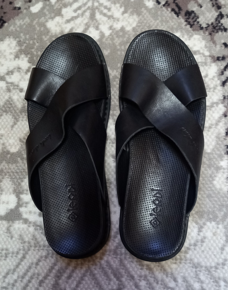 Верхняя кожаная часть шлепок выполнена в виде скрещивающихся ремешков. Ортопедическая подошва этих сандалий подарит мягкость и легкость, что делает их отличным решением для дома, дачи и улицы. Темные спортивные сланцы хорошо впишутся в гардероб любого мужчины или подростка. Благодаря классическому дизайну эти пантолеты будут актуально смотреться на весенних прогулках вдоль моря или береговой линии. А также будут комфортны как комнатные тапки.